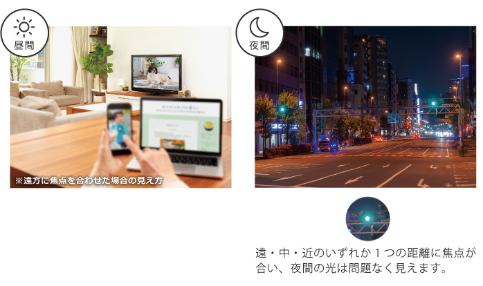 ※1 3つの焦点距離にあるものを、クリアに見えられますが、焦点距離のものであっても、