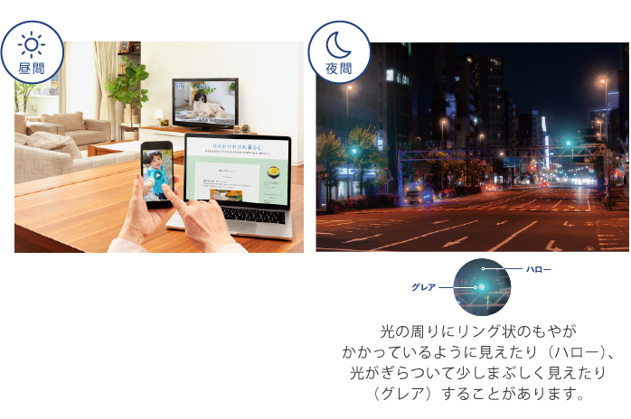 眼内レンズはあらかじめ設定した距離に焦点が合うようになっているので、レンズによって見え方が異なります。夜間は、レンズの種類によって電灯や車のライトが散乱して見えたり、ライトの周りに丸い輪状の光が見えたりすることがあります(グレア・ハローと呼ばれます)。
